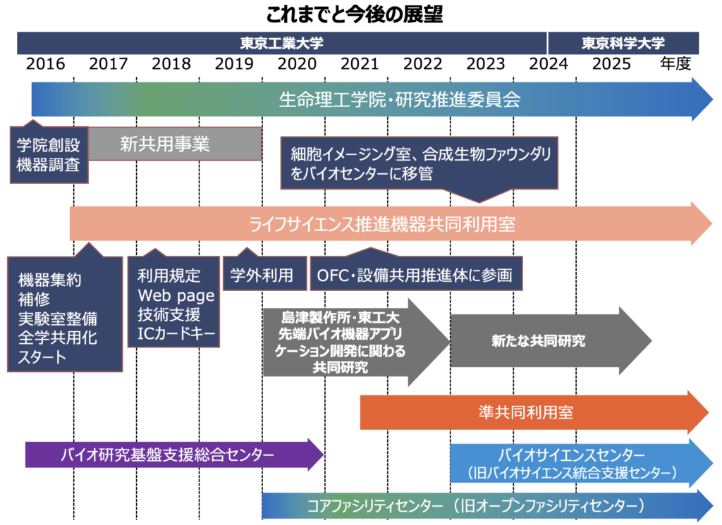 The Life Science Promotion Equipment Shared Use Room (hereinafter referred to as the Shared Use Room) was established within the School of Life Science and Technology in 2017 to promote the shared use of cutting-edge equipment related to life sciences across the university. In 2017, it began by establishing the “Shimadzu Corporation Precision Instrument Analysis Room” (Suzukakedai Campus Building B1, 1st Floor), the first facility in Japan dedicated to promoting shared use of equipment through industry-academia collaboration. Supported by the Ministry of Education, Culture, Sports, Science and Technology’s Advanced Infrastructure Sharing Promotion Project, adopted that same year, it advanced the sharing of equipment. In fiscal year 2018, a shared laboratory and shared office space, serving as the core for utilizing various shared instruments provided by laboratories within the School of Life Science and Technology, were established on the 3rd floor of Building B2 on the Suzukakedai Campus. This space began full-scale operation as the “School of Life Science and Technology Life Science Promotion Instrument Sharing Room.” Furthermore, this shared facility has worked in collaboration with the Comprehensive Center for Bio-Research Infrastructure Support, which was already established and widely used as a university-wide shared facility for bio-related research. It has strived to widely share various advanced life science-related instruments that had not previously been shared at the university, aiming to contribute to the development of life science fields at the university.
