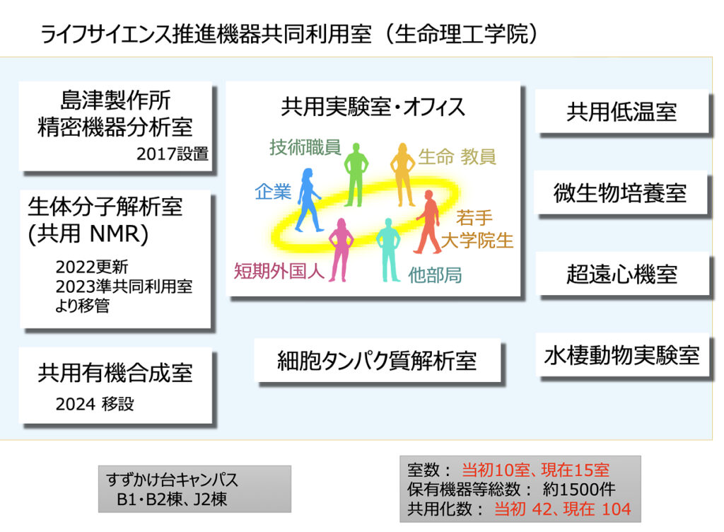 The operation of the Shared Facilities Room is managed by the Research Promotion Committee established within the School of Life Science and Technology. Additionally, the “Life Science Shared Facilities Support Office” (comprising 7 members: 1 Professor, 1 Associate Professor, 1 Assistant Professor, and 4 technical/administrative support staff) is located within this Shared Facilities Room. This office maintains and manages the shared equipment and shared laboratories administered by the Shared Facilities Room.